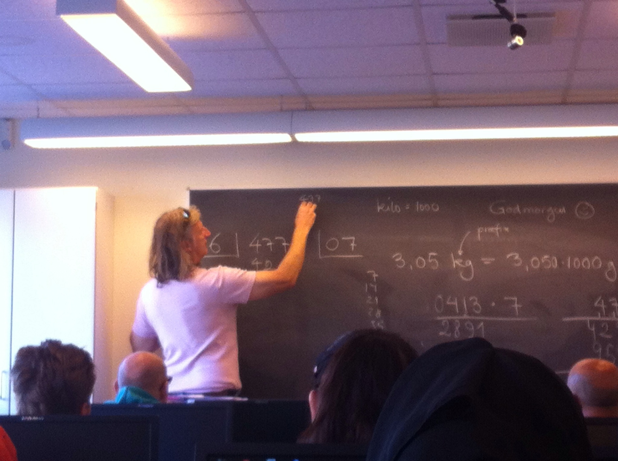 今、デンマークで中学卒業レベルの基礎教育をやっています。 とてもためになるけど、時々やり方が日本の教育のと違っていて混乱することがあります。 例えばこの写真で先生が説明してるのが、割り算の暗算のし方。 こんな風に書くのは新鮮でした。