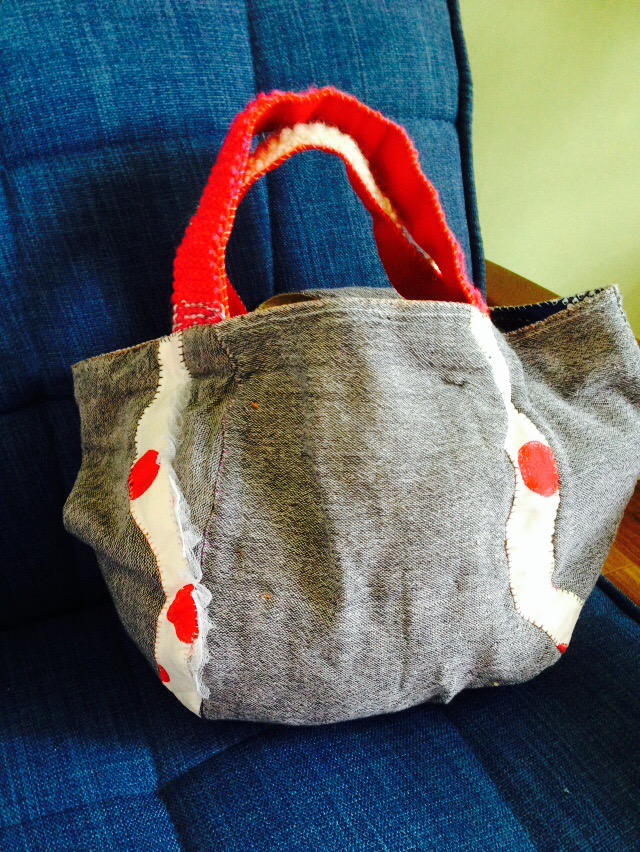 なみなみの模様を入れたバッグ。手縫いなので、最低限のものがあればどこでも作れるのが好きです。。