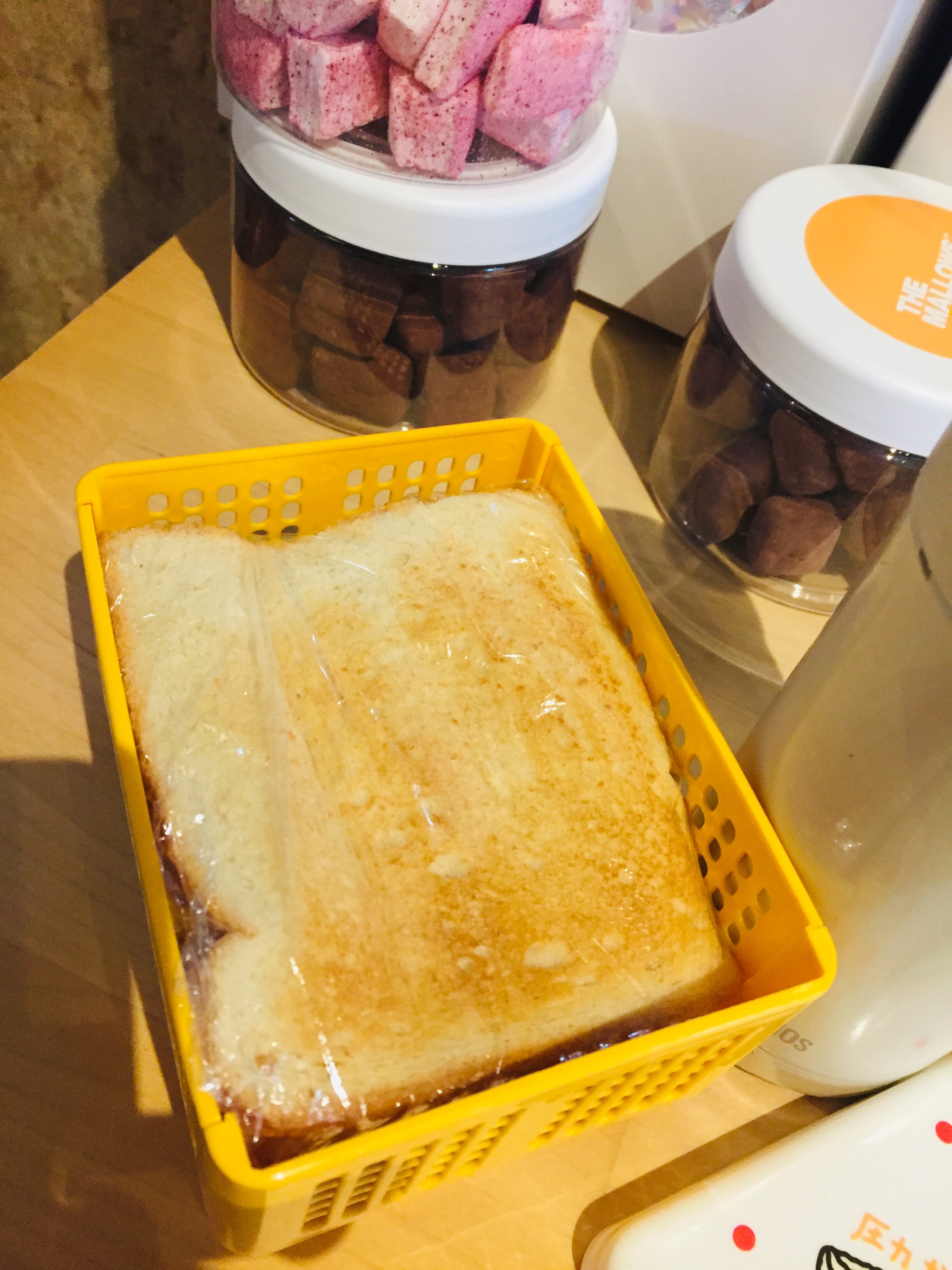 圧力かけないためのサンドイッチボックスの中にギューギューに詰め込まれたサンドイッチ。ちょっとぎゅーぎゅー感が伝わりづらい写真ですが。。