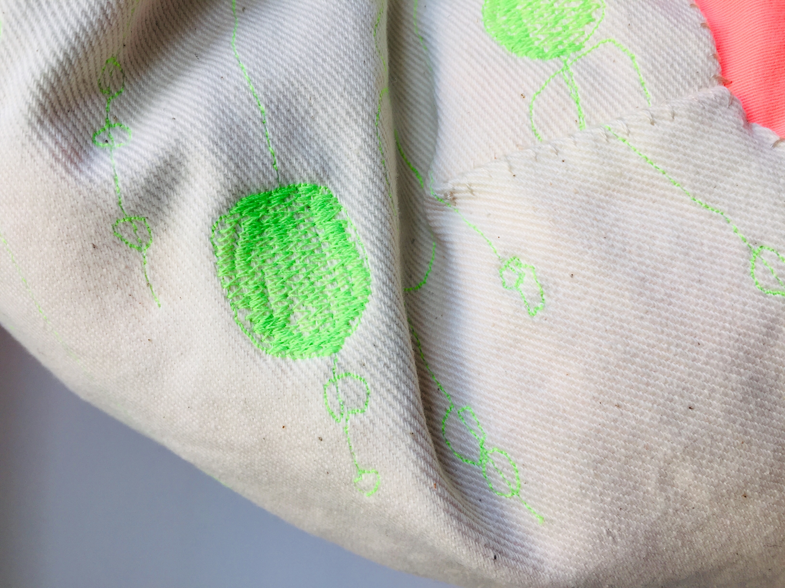 ミシンで刺繍したバッグ。ネオンカラーは、使いやすい色の一つです。イメージがしやすいんでしょうね。買った後にイメージ通りに仕上がってくれる感じが好きです。