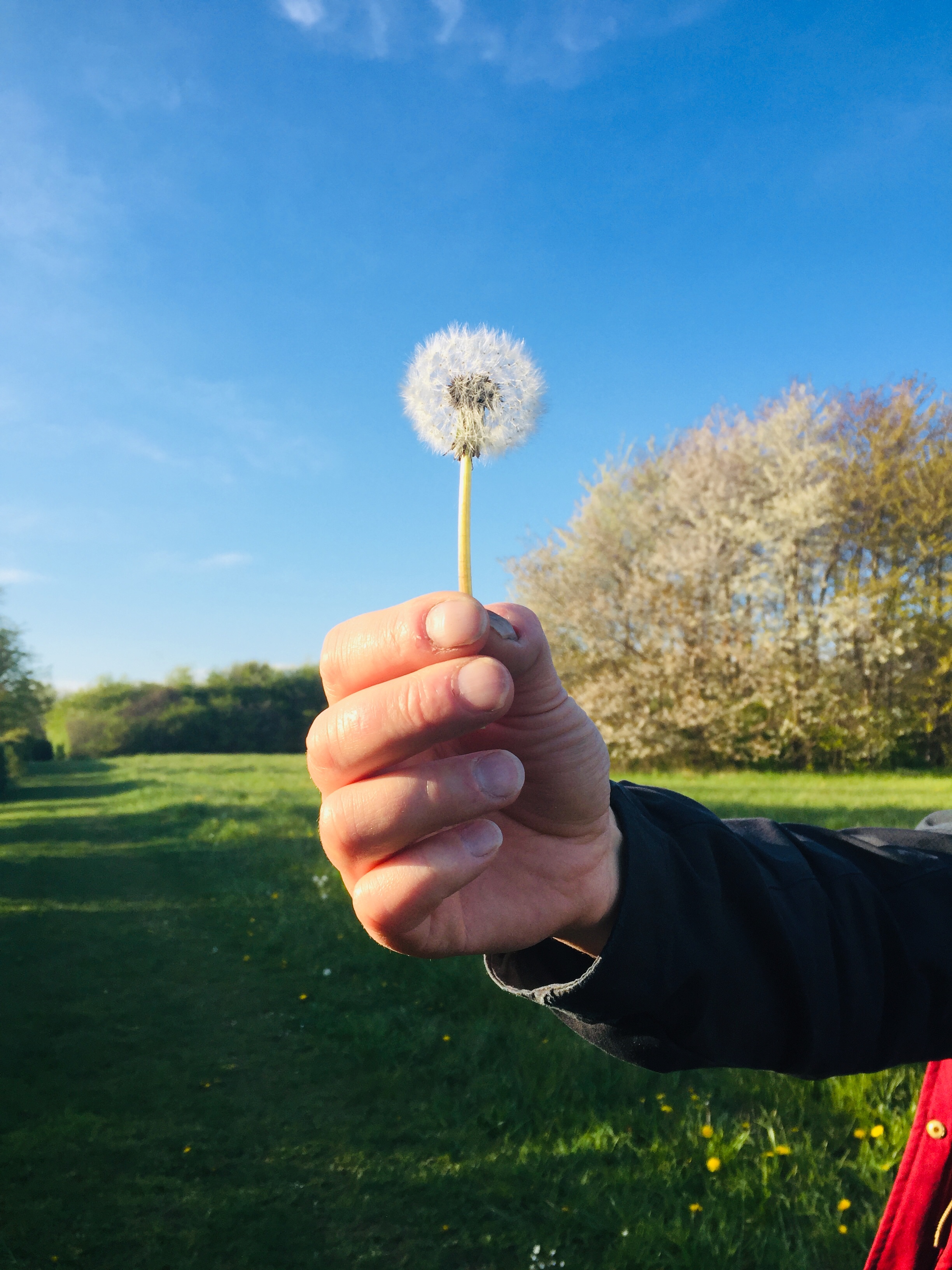 家具職人の手にタンポポの綿毛。