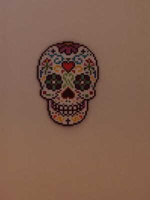 この写真のガイコツは以前むすめがお父さんと行った蚤の市で購入してきたもので、誰かの手作りです。(アイロンビーズ)