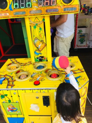 もぐらたたきは、作動していない。もぐらたたきを初めて見たのに、ハンマーであのモグラを叩くのは本能的に心得ているようです。